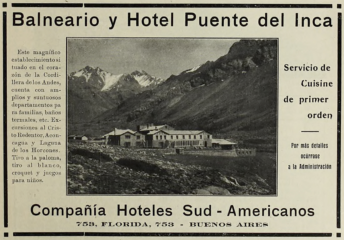 El desaparecido hotel de Puente del Inca, por la bondad de sus aguas termales, el tranquilo entorno, la pureza del aire y la belleza de la montaña, era un verdadero atractivo para las clases altas de Buenos Aires. Viajaban en el tren trasandino y ni siquiera descendían en la escala de Mendoza. Iban directamente a Puente del Inca. Allí descendían con sus largos vestidos y sus baúles de ropa para lucir durante su prolongada estancia, muchas veces de un mes. El personal del hotel, pese a la puna que a la hora de la llegada del tren se hacía sentir más en ese sitio a 2.720 metros de altura, trasladaba a pie trabajosamente ese equipaje hasta el hotel, ubicando a los pasajeros en sus habitaciones. El llamado "pabellón del río" era el más pedido, por su maravillosa vista hacia el valle.